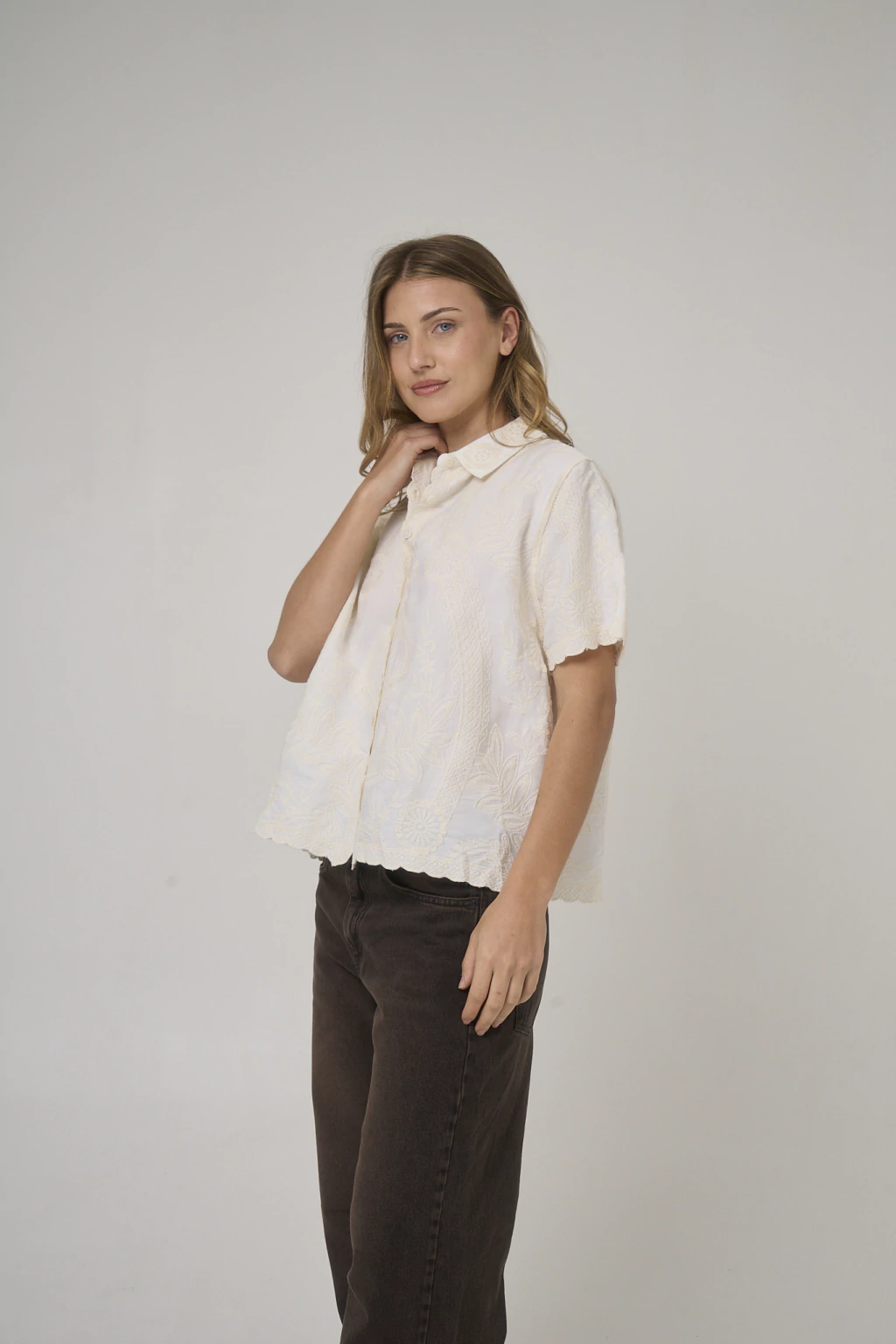 Descubrí la Camisa Anne, una prenda de manga corta que destaca por su bordado y broderie delica