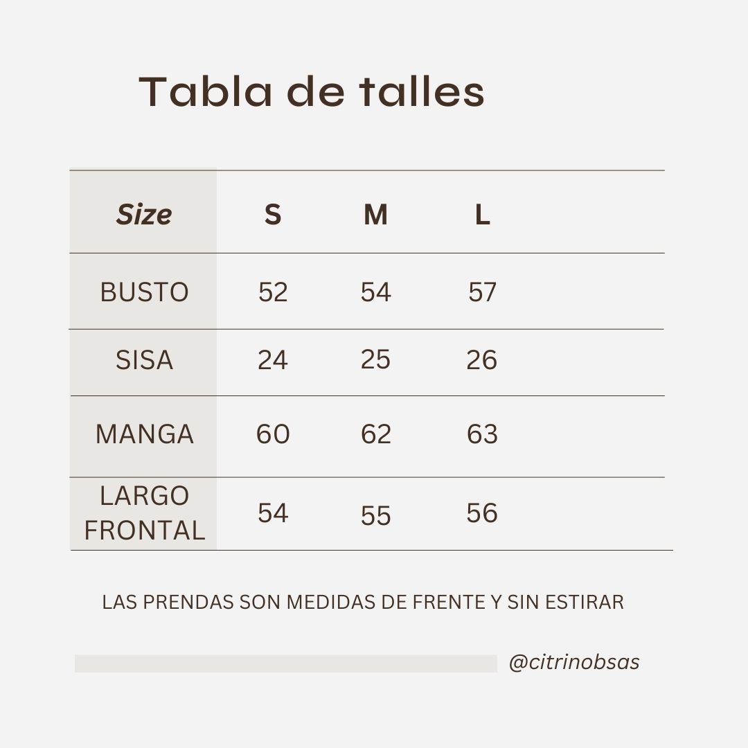 Las medidas están tomadas con la prenda apoyada en plano, de frente y sin estirar. Pueden variar mínimamente según el modelo.