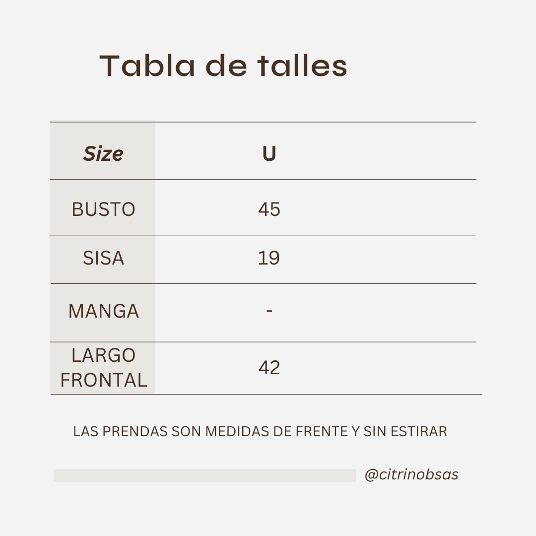 Top Vivian: delicadeza y estilo con bordados y apliques Descubrí el Top Vivian, una prenda que combina diseño y elegancia para realzar tu look diario. Sus bordados y apliques cuidadosamente elaborados aportan un toque único y sofisticado, ideal para cualquier ocasión. Confeccionado con materiales de alta calidad, garantiza comodidad y un ajuste perfecto. Sumá el Top Vivian a tu guardarropa y destacate con una prenda llena de detalles que marcan la diferencia. Medidas tomadas con la prenda en plano, sin estirar. Pueden variar mínimamente según el modelo.